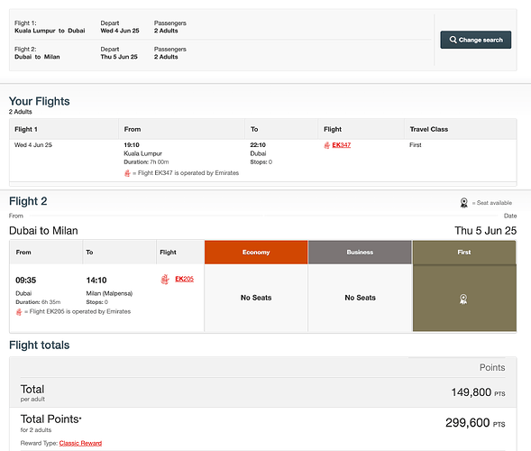 As for how many points it’s going to cost you?? About 300,000 for 2 Adults in 1st Class is you were to fly from Kuala Lumpur - Dubai - Milan. The Milan flight is an A380. It will cost you about AUD$2,650.00 in fees and taxes for the 2 of you.
