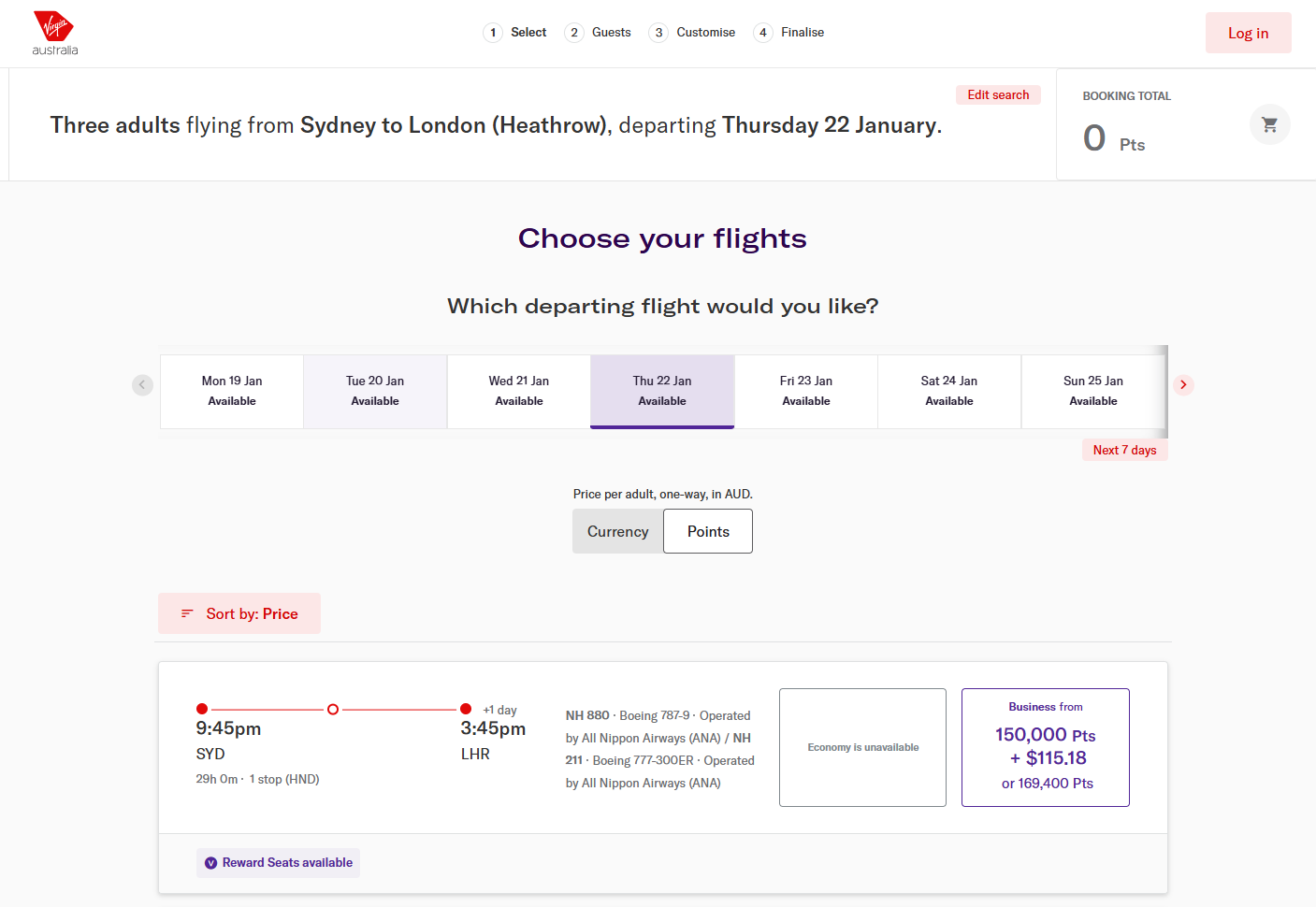 I just tried for the first time to actually book one of these 3 X Business Rewards which you can force to appear on random dates by just repeatedly searching dates with 3 X Passengers. Alas… after clicking to book the flight, and being able to even enter the 3 passengers details and credit card details to pay the surcharges… it then comes up with a message at the very end… “The fare is no longer available”. So these are “mirages” that appear in error. They are obviously “mistakes” in the Virgin search engine.